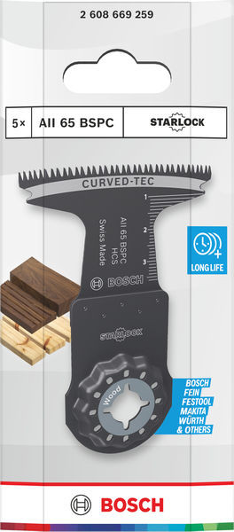 Curved-Tec Blatt für kontrollierte und saubere Tauchschnitte Das AII 65 BSPC Tauchsägeblatt ist ein langlebiges Multifunktionswerkzeug für Profis aus verschiedenen Gewerken, die saubere und präzise breite Tauchschnitte in Hartholz und Weichholz, Platten und Möbelkomponenten ausführen müssen.