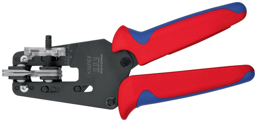 12 12 12 Präzisions-Abisolierzange Formschlüssiges Abisolieren auch von schwer zu entfernenden Isolierwerkstoffen aus PTFE · Silikon · Radox® · Kapton® und Gummi · auch mehrlagig. Ein zweites Messerpaar hält die verbleibende Isolierung zuverlässig fest. Genau auf den jeweiligen Leiterquerschnitt abgestimmte · auswechselbare Formmesser. Mit einstellbarem Längenanschlag für gleiche Abisolierlängen bei Serienarbeit. für Solarkabel · speziell abgestimmt auf mehrlagige und auf Radox®-Isolierungen. mit zusätzlicher Kabelabstützung für eine bessere Zentrierung mehrlagig isolierter Leiter in den Abisolierprofilen. Kapton® ist ein eingetragenes Warenzeichen der E. I. du Pont de Nemours and Company. Radox® ist ein eingetragenes Warenzeichen der Huber & Suhner AG. - Abisolierwerte Quadratmillimeter: 4,0 / 6,0 / 10,0mm² - AWG: 8 / 10 / 12