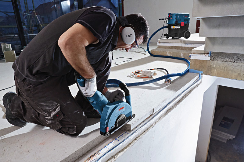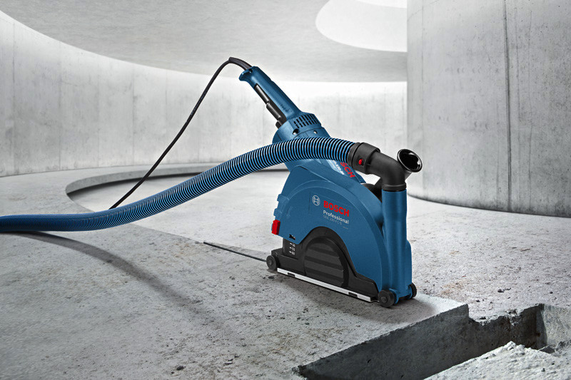 Systemzubehör GDE 230 FC-S, Die GDE 230 FC-S Professional ist Boschs Full Cover-Absaughaube für Winkelschleifer mit Standardschutzvorrichtung und 230 mm Scheibendurchmesser. Ihr geschlossenes Design sorgt für eine optimierte Staubabsaugung und damit für nahezu staubfreies Arbeiten. Unkompliziertes Handling wird durch eine praktische 360°-Verbindung zwischen Winkelschleifer und Staubsauger ermöglicht. Einstellbare Schnitttiefe und integrierte Rollen unterstützen präzises Arbeiten. Die Absaughaube ist kompatibel mit dem Bosch Click & Clean System sowie zahlreichen Winkelschleifern mit Standardschutzvorrichtung.