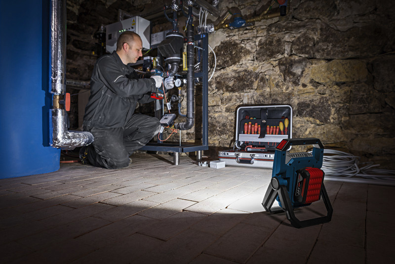 Akku-Bauleuchte GLI 18V-1900, Dies ist der vielseitige Bosch Baustrahler aus dem 18V-Sortiment. Ihre leistungsstarke LED sorgt mit bis zu 1.900 Lumen für eine exzellente Beleuchtung. Sie bietet außerdem zwei Helligkeitsstufen, fünf flexible Einstellwinkel und ein 5/8"-Stativgewinde für eine schnelle Anpassung an jede Arbeitssituation. Sie eignet sich auch hervorragend, um ganze Arbeitsbereiche für den gesamten Arbeitstag zu beleuchten. Dieser Baustrahler ist kompatibel mit allen Bosch Professional 18V-Akkus (Professional 18V System). Auch kompatibel mit AMPShare, der markenübergreifenden Akku-Allianz. Karton