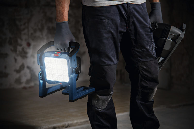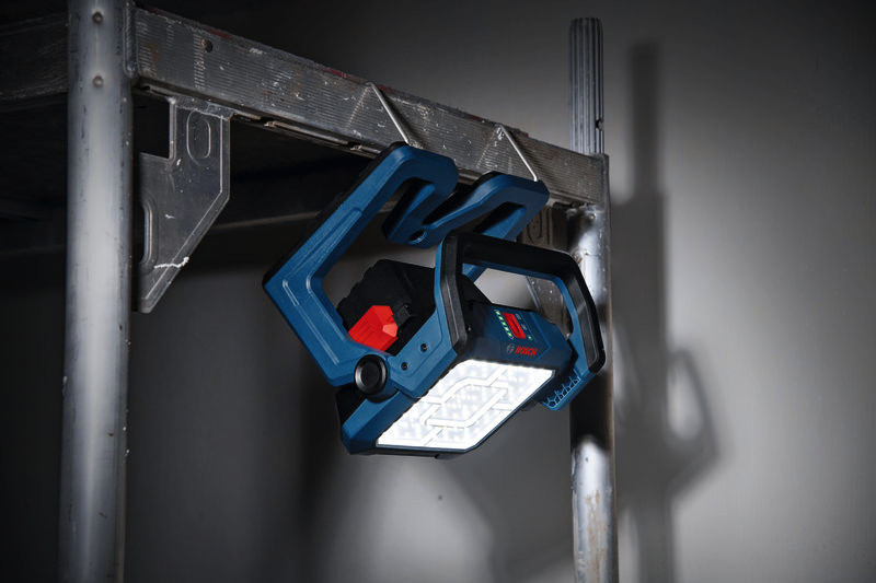 Akku-Bauleuchte GLI18V-5000, Die PRO GLI18V-5000 sorgt für eine hervorragende Ausleuchtung des Arbeitsbereichs. Die 80 LEDs lassen sich mit 3 Helligkeitsstufen bis auf 5000 Lumen einstellen. Die kompakte Bauweise der Bauleuchte mit starkem Magneten, 5/8-Stativgewinde und Metallhaken bietet dir maximale Vielseitigkeit. Ihr stufenlos um 135° schwenkbarer Leuchtenkopf bringen Licht in jede Ecke, und durch die Ein-Schalter-Bedienung ist sie leicht zu verwenden. Sie ist dank einer robusten Akkuabdeckung gemäß IP 54 staubdicht und spritzwassergeschützt. Er verfügt über eine User Interface mit Helligkeitsanzeige und Ladezustandsanzeige. Die PRO GLI18V-5000 beleuchtet mittelgroße bis große Arbeitsbereiche. Kompatibel mit dem Bosch Professional 18V System und der markenübergreifenden AMPShare Akku-Allianz. Karton
