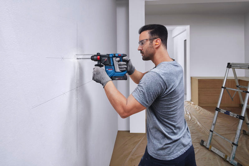 Akku-Bohrhammer mit SDS plus GBH 18V-18, Dann ist der Bohrhammer Bosch GBH 18V-18 Professional genau das richtige Werkzeug für dich. KickBack Control stellt bei diesem kompakten und gleichzeitig kraftvollen Akku-Bohrhammer sicher, dass der Motor sofort anhält, wenn der Bohrer im Material klemmt, wodurch typische Rückschlagverletzungen vermieden werden. Vibration Control dämpft Vibrationen, um Taubheit von Hand und Arm zu vermeiden. Dieser leichte Akku-Bohrhammer liefert volle Leistung selbst mit lediglich einem 18V-/2,0-Ah-Akku, damit extreme Power weniger schwer in der Hand liegt. Dank seines robusten bürstenlosen Motors mit kontinuierlicher Leistungsabgabe und konstanter Drehzahl reicht eine einzelne Akkuladung aus, um bis zu 50 Löcher in Beton zu bohren. Der Bohrhammer Bosch GBH 18V-18 Professional ist ideal für Handwerker wie Schrankbauer, Tischler, Glaser und Hausmeister, die mit Beton, Holz und Metall arbeiten. Er ist der leichteste Akku-Bohrhammer von Bosch Professional der 18V-Serie und liefert volle Leistung mit lediglich einem 18V-2,0-Ah-Akku. Der Bohrhammer Bosch GBH 18V-18 Professional verfügt über einen robusten bürstenlosen Motor und kann zum Schlagbohren in Beton sowie zum Bohren in Holz oder Metall verwendet werden. Außerdem ist er mit KickBack Control und Vibration Control ausgestattet. Karton. Tiefenanschlag (1 613 001 009). Zusatzhandgriff (1 619 P16 971)