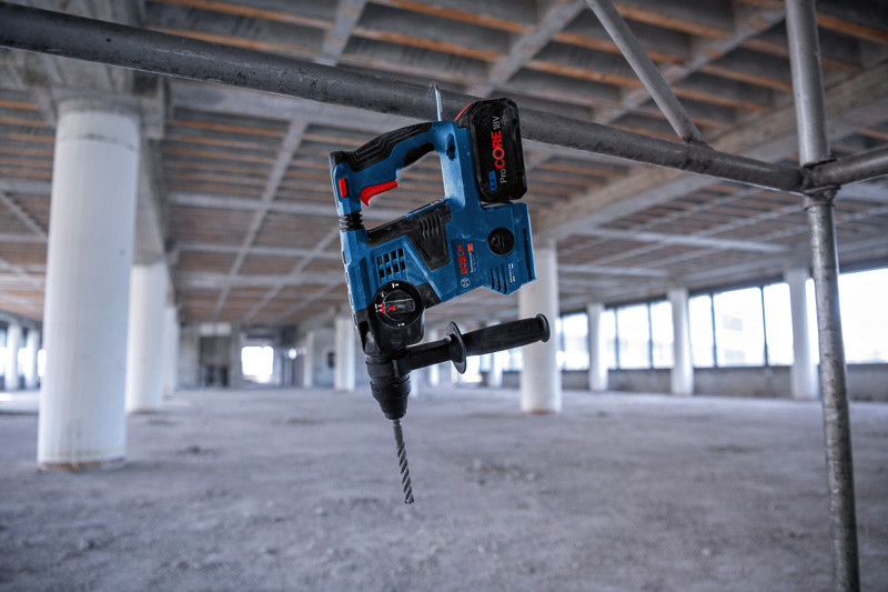 Akku-Bohrhammer mit SDS plus GBH 18V-28 CF, Dieses Gerät ist für alle, die kabelgebundene Leistung mit kabelloser Freiheit wünschen. Dieser Bohrhammer verfügt über einen kraftvollen, bürstenlosen Motor der beim bewährten Schlagmechanismus für eine Schlagenergie von 3,3 J sorgt. Das leicht ablesbare User Interface zeigt den Werkzeugstatus an und erlaubt dem Anwender die Auswahl zwischen drei verschiedenen Betriebsarten (Auto, Favorite, Soft) für perfekte Kontrolle bei jeder Arbeit, und das Schnellwechselfutter ermöglicht werkzeuglose Aufsatzwechsel mit kürzeren Arbeitsunterbrechungen. Vibration Control, KickBack Control und Kompatibilität mit der GDE 18V-16 Professional für staubfreies Bohren sorgen für umfassenden Anwenderschutz. Dieser Bohrhammer ist ideal für die Anwendung in Beton, Stein und Mauerwerk. Er ist mit allen Akkus und Ladegeräten aus dem Bosch Professional 18V System kompatibel. Für eine staubfreie und sicherere Arbeitsumgebung lässt sich die Staubabsaugung GDE 18V-16 Professional unkompliziert montieren. Auch kompatibel mit AMPShare, der markenübergreifenden Akku-Allianz. Das Werkzeug verfügt außerdem über einen Aufbewahrungshaken und ein LED-Licht. L-BOXX 238 (1 600 A01 2G2). L-BOXX-Einlage (1 600 A02 SJ3). Wechselfutter SDS plus (2 608 572 213). Staubabsaugsystem GDE 18V-16 Professional (1 600 A00 51M). Schnellladegerät GAL 1880 CV (1 600 A00 B8G). 2 x Akku ProCORE18V 8.0Ah (1 600 A01 6GK). 1 x Bluetooth Low Energy Modul GCY 42 Professional (1 600 A01 3WF). Zusatzhandgriff (2 602 025 191). Tiefenanschlag (1 613 001 009). Reinigungstuch (1 619 200 413). Fetttube (ET-Nr. 1 615 430 010)
