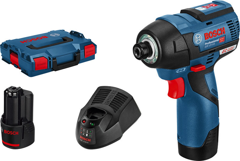 Akku-Drehschlagschrauber GDR 12V-110, Dieser Akku-Drehschlagschrauber mit bürstenlosem Motor ist die kompakteste Lösung aus der 12-Volt-Klasse von Bosch. Sein kompaktes Design gewährleistet auch an engsten Stellen und über Kopf eine perfekte Handhabung. Für größere Genauigkeit beim Schrauben verhindert die 2-stufige Power Control des Drehschlagschraubers das Überdrehen kleiner Schrauben. Das Gerät verfügt über ein kraftvolles Drehmoment von 110 Nm und eignet sich somit für die meisten gängigen Akku-Drehschlagschrauber-Anwendungen. Dieses Gerät eignet sich für Schrauben mit einem Durchmesser von M4 bis M12. Das Gerät ist mit allen Bosch Professional 12V-Akkus und -Ladegeräten (Professional 12V System) kompatibel. Dieses Gerät verfügt außerdem über Ladezustandsanzeige, Electronic Cell Protection, Lithium-Ionen-Akku, Drehzahlvorwahl und variable Drehzahl. L-BOXX 102 (1 600 A01 2FZ). 2 x Akku GBA 12V 3.0Ah (1 600 A00 X79). Schnellladegerät GAL 12V-40 Professional (1 600 A01 9R3). L-BOXX-Einlage für Gerät. L-BOXX-Einlage für Zubehöre