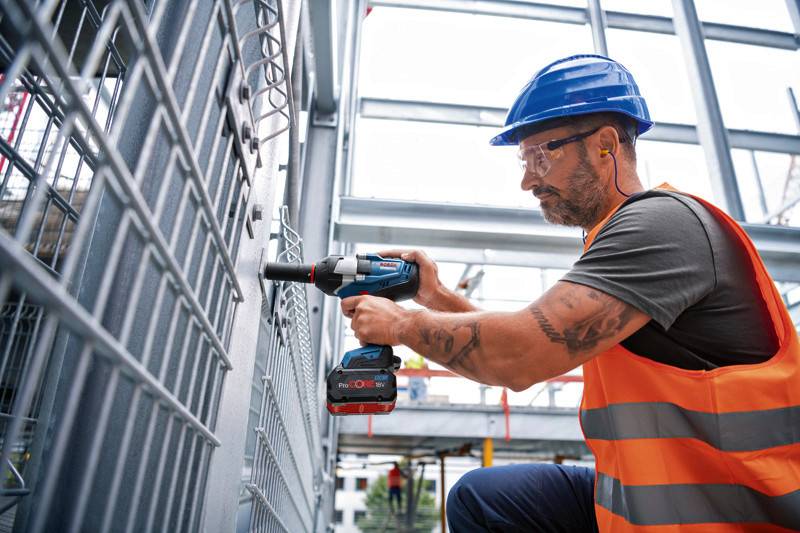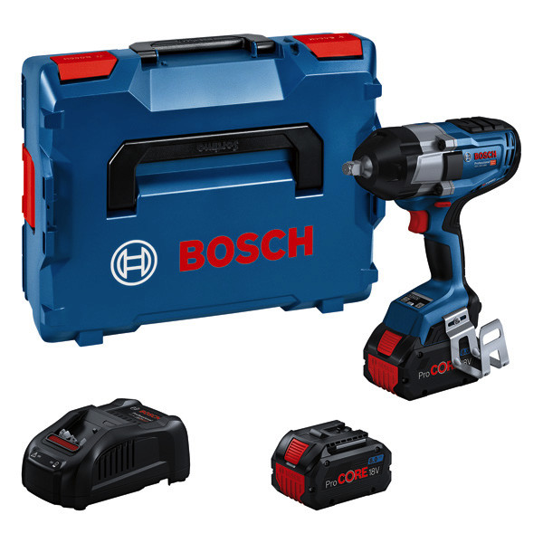 Akku-Drehschlagschrauber GDS 18V-1000, Der GDS 18V-1000 Professional ist der leistungsstarke 1/2"-Drehschlagschrauber mit BITURBO Brushless-Technologie. Seine kabellose Freiheit mit hervorragender Leistung ist dem kraftvollen bürstenlosen Motor zu verdanken, der seine optimale Leistung durch ProCORE18V-Akkus erreicht. Das neue Schlagwerk wurde für ein maximales Anziehmoment von 1.000 Nm und ein maximales Losbrechmoment von bis zu 1.600 Nm konzipiert, und bietet optimale Leistung bei Arbeiten unter schwierigsten Bedingungen. Drei Einstellungen sorgen für ausgezeichnete Kontrolle über Drehzahl und Drehmoment und somit hohe Vielseitigkeit. Der Drehschlagschrauber ist perfekt für Metallanwendungen mit Maschinenschrauben von M 10 bis M 24 wie Stahlbaukonstruktionen, Metallverbindungen, Rohrmontage, LKW-Instandhaltung und Holzkonstruktionen. Er ist kompatibel mit allen Bosch Professional 18V-Akkus und -Ladegeräten (Professional 18V System). für maximale Leistung ProCORE18V ? 5,5 Ah verwenden. Auch kompatibel mit AMPShare, der markenübergreifenden Akku-Allianz. Der GDS 18V-1000 Professional verfügt über ECP und EMP, eine Werkzeugstatusanzeige, LED-Licht, eine 1/2"-Werkzeugaufnahme mit Sprengring, und einen Aufbewahrungsclip. 2 x Akku ProCORE18V 8.0Ah (1 600 A01 6GK). Schnellladegerät GAL 1880 CV (1 600 A00 B8G). L-BOXX 136 (1 600 A01 2G0). 1/1 L-BOXX-Einlage für Gerät und Ladegerät (1 600 A02 58Y). Leiterclip (1600 A02 3G7)