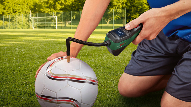 Akku-Druckluftpumpe EasyPump. Kompakt und handlich: Aufpumpen von Fahrradreifen und Bällen zu Hause oder unterwegs. Aufpumpen bis 10,3 bar mit Echtzeitmessung und Autostopp-Funktion. Ideal zum Aufpumpen von Reifen (Auto, Motorrad, Fahrrad), Bällen und kleineren Wassersportartikeln. Alles griffbereit zur Hand: Verschiedene Adapter sind ordentlich im Werkzeuggriff verstaut. Intuitiv und praktisch: bedienerfreundliches, ergonomisches und kleines Design mit großem Display. Integrierter Akku und USB-C®-Ladung, helle Beleuchtung durch LED-Licht. Französisches Ventil. Ballnadel. Volumenadapter. USB-Kabel. Stofftasche
