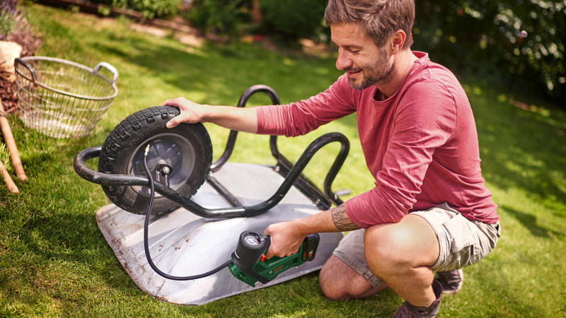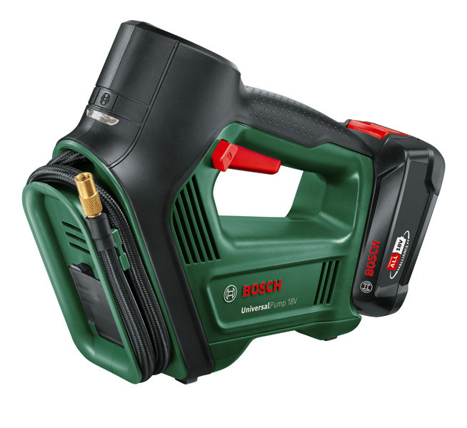 Akku-Druckluftpumpe UniversalPump 18V. Schnelles Aufpumpen von Auto-, Motorrad-, Wohnwagen- und Fahrradreifen. Schnelles Aufpumpen mit bis zu 30 l/min auf bis zu 10,3 bar. mit intuitiver Steuerung per Fingerdruck. Handliche, kompakte Pumpe mit unterbrechungsfreier Messung über ein beleuchtetes Manometer. Aufbewahrung direkt am Werkzeug: Verschiedene Adapter sind ordentlich an der Werkzeugvorderseite verstaut. Pumpt größere Gegenstände auf, die einen hohen Druck erfordern (wie Reifen und Bälle). Beleuchteter Ventilbereich und Akkustatusanzeige. 1 x Akku PBA 18V 2.0Ah. Französisches Ventil. Volumenadapter. Ballnadel. Ladegerät AL 18V-20. Karton