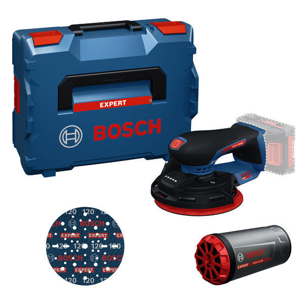 Akku-Exzenterschleifer EXEX18V-150-5, Der Exzenterschleifer EXPERT EXEX18V-150-5 bietet eine exzellente Abtragsleistung, schnelle Arbeitsfortschritte und eine hohe Oberflächenqualität. Möglich wird das durch seinen 5-mm-Schwingkreis, den 150-mm-Schleifteller und die konstante Leistung. Die herausragende Ergonomie des Werkzeugs ermöglicht die einfache einhändige und beidhändige Bedienung. Die ausgewogene Balance und die niedrige Werkzeughöhe, mit dem Griff nahe am Werkstück, gewährleisten optimale Kontrolle in allen Arbeitspositionen. Der Multi-Loch-Schleifteller mit Venturi-Luftkanälen und eine innovative HEPA-Filter-Staubbox mit integrierter Click&Clean-Schnittstelle sorgen für bestmöglichen Staubschutz. Dank anwenderfreundlicher HMI ist die Bedienung sehr einfach und intuitiv: Sie ermöglicht die Geschwindigkeitssteuerung in 5 Stufen und meldet den Akkustatus über eine klare Anzeige mit 5 LEDs Der EXPERT EXEX18V-150-5 ist ideal zum Entfernen von Holz, Farbe und Lack sowie zum Zwischen- und Feinschleifen von Oberflächen. Kompatibel mit dem Bosch Professional 18V System und der markenübergreifenden AMPShare Akku-Allianz L-BOXX 162 (1 600 A03 8TU). L-BOXX-Einlage (1 600 A03 811). Schutzring für 150 mm (2 608 000 895). 1 x Schleiffolie O780, Expert Multi Material, 120 (separat erhältlich als 6er-Pack: 2 608 902 442). 1 x Staubbox mit HEPA-Filter und Click&Clean-Adapter (2 608 001 113)