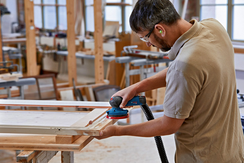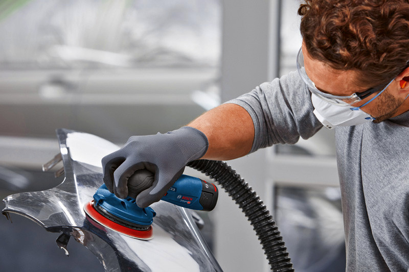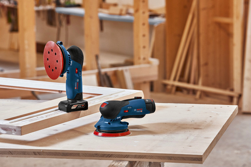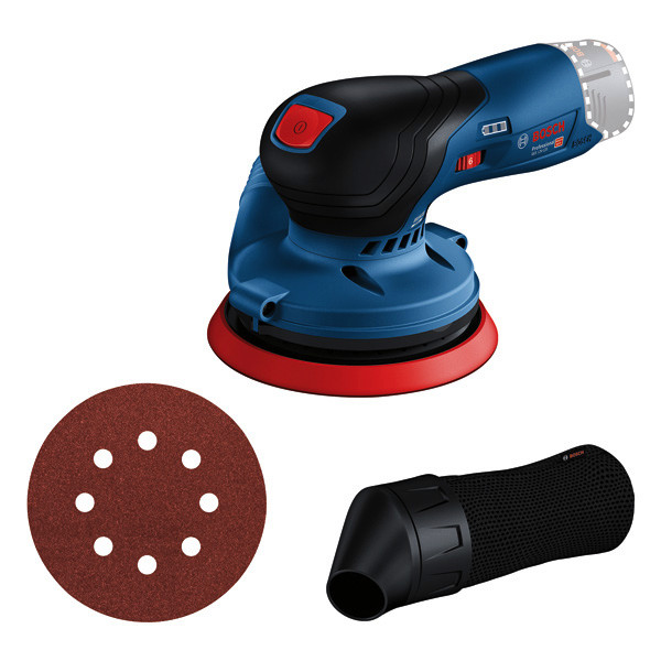 Akku-Exzenterschleifer GEX 12V-125, Der Exzenterschleifer GEX 12V-125 Professional ist die kompakte Lösung für Profis, die immer unterwegs sind. Seine hervorragende Balance nahe des Werkstücks und die ausgezeichnete Ergonomie von Handauflage und Handgriff gewährleisten optimale Werkzeugkontrolle. Mit seinem schlanken und kompakten Design ermöglicht dieser 12V-Exzenterschleifer das Arbeiten in engen Ecken. Sein intuitives Bedienungskonzept sorgt für ein einfaches Handling. Der kabellose GEX 12V-125 Professional eignet sich zum einfachen Schleifen, Zwischenschleifen, Lackentfernen und Feinschleifen. Er ist auf Holz, Furnier, Lack, Füllstoffen sowie Mineral- und Acrylflächen einsetzbar. Er ist mit dem Professional 12V System und dem Bosch Click & Clean Staubabsaugsystem kompatibel. Der GEX 12V-125 Professional verfügt auch über einen Staubbeutel, Drehzahlvorwahl, Akku-Ladezustandsanzeige, einen bürstenlosen Motor, und einen 125-mm-Schleifteller mit Klettverschluss zur Schleifblattbefestigung. Schleifteller (125 mm) (2 608 000 714). 1 x Schleifblatt C430, Expert for Wood+Paint, 120 (separat erhältlich als 5er-Pack: 2 608 605 643). Staubbeutel (2 608 000 715)