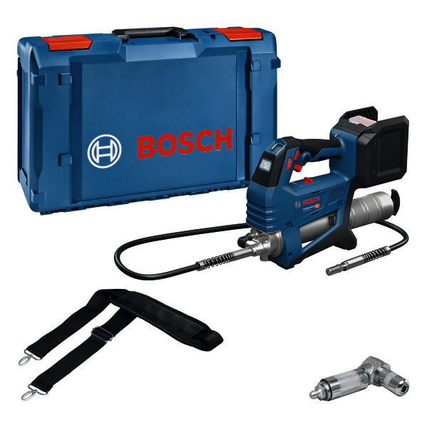 Akku-Fettpresse GFP 18V-10, Die Bosch Fettpresse GFP 18V-10 erleichtert das Schmieren. Mit einem praktischen Pumpmodus kannst du die genaue Anzahl der Pumphübe sowie die spezifische Dosierung definieren, die du benötigst. Die Schmierung ist schnell, effizient und mühelos dank 2 Geschwindigkeitsmodi, die einen optimalen Druck und Durchfluss gewährleisten. Mit dem langen Schlauch und der abgewinkelten Kupplung kannst du auch schwer zugängliche Armaturen bequem schmieren. Außerdem kannst du jede beliebige Kartusche verwenden die GFP 18V-10 ist mit allen gängigen Kartuschensystemen kompatibel. Die Fettpresse GFP 18V-10 ist für die Schmierung aller Arten von beweglichen Teilen geeignet. Dieses Werkzeug hat einen max. Betriebsdruck von 10.000 psi und eine max. Durchflussmenge von bis zu 320 g/min. Es ist mit einem 1200 mm langen Schlauch, einer geraden und einer 90°-Kupplung sowie einer LED-Leuchte ausgestattet und kommt mit einem Pumpenmodus für präzise Dosierung.