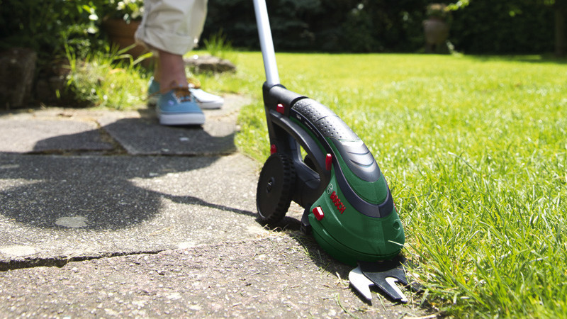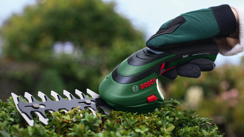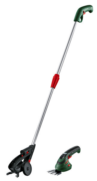 Akku-Gras- und Strauchschere Isio. Der unentbehrliche Helfer im Garten. Kompaktes Handwerkzeug, perfekt zum Formen von Büschen und Sträuchern. Leichtes und ergonomisches Design für Komfort und müheloses Schneiden. Langlebiger 3,6-V-Lithium-Ionen-Akku ist jederzeit einsatzbereit mit bis zu 50 Minuten Laufzeit. Leistungsstarker Antrieb und Anti-Blockier-System für eine nahezu blockierfreie Extra-Schnittleistung. Multi-Click-Grasscherblatt 8 cm (F 016 800 326). Teleskopstiel (F 016 800 329). Ladegerät. Karton