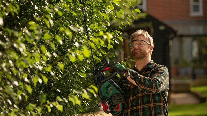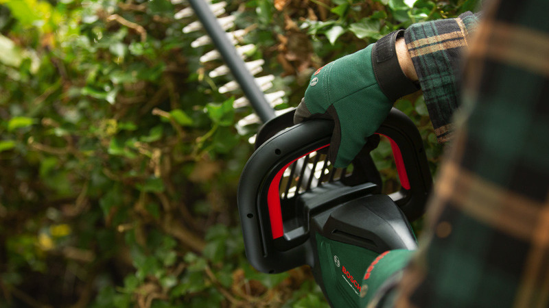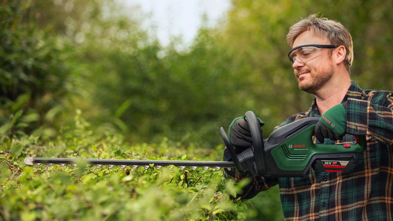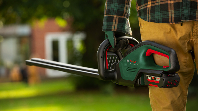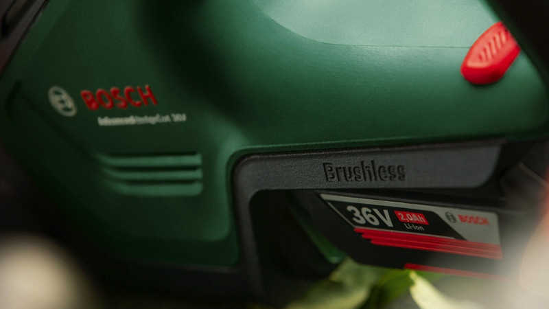 Akku-Heckenschere AdvancedHedgeCut 36V-65-28. Leistungsstarke Akku-Heckenschere für dichtere Hecken. Bürstenloser Motor liefert Hochleistung für anspruchsvolles Schneiden. Mühelose Handhabung dank leichtem und ergonomischem Design. Patentiertes Bosch Anti-Blockier-System verhindert ein Verklemmen für übergangsloses Schneiden. Schnittgeschwindigkeit entspricht der Leistung eines kabelgebundenen Geräts. Beeindruckende Schnittergebnisse bei bis zu 28 mm dicken Ästen, z. B. bei Weißdorn- und Berberitzenhecken. Syneon Technology für optimale Kraft und Ausdauer nach Bedarf. 36V POWER FOR ALL der Akku für alle Bosch 36V-Home & Garden-Gartengeräte. 1 x Akku 36V 2,0Ah. Messerabdeckung. Ladegerät AL 36V-20. Kartonschachtel