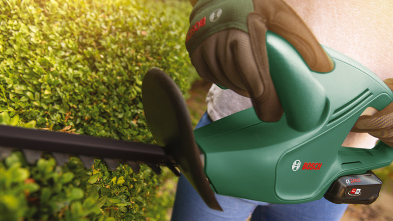 Akku-Heckenschere EasyHedgeCut 18-45. Einfaches und leichtes Schneiden mit optimaler Leistung. Bosch Anti-Blockier-System sorgt für unterbrechungsfreies Schneiden. Leichte Akku-Heckenschere (18V). 45 cm Messerlänge und 15 mm Zahnabstand für leichte Trimmarbeiten. Kabellose Mobilität für Bewegungsfreiheit im gesamten Garten. POWER FOR ALL ALLIANCE: 1 Akku, 10+ Marken, 150+ Produkte. Messerabdeckung. Karton