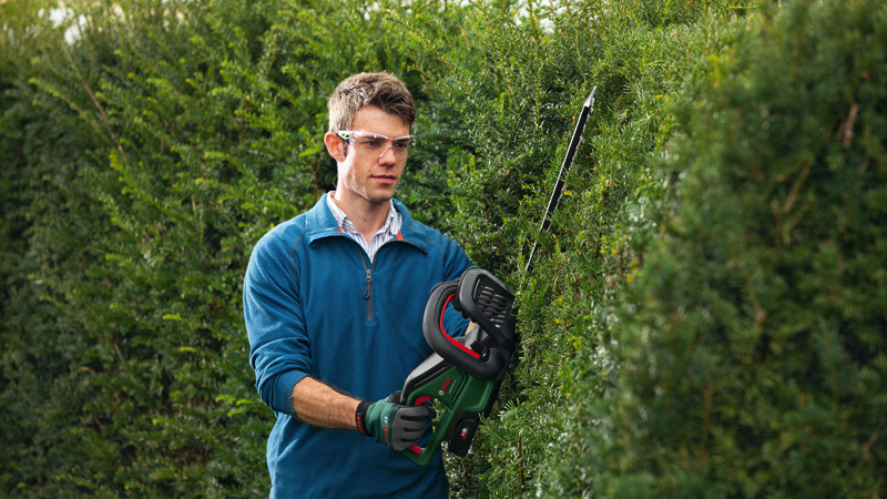 Akku-Heckenschere UniversalHedgeCut 18V-55. Starke und leichte 18V-Heckenschere für präzise Ergebnisse bei mittelgroßen Hecken. Hohe Leistung und lange Lebensdauer dank bürstenlosem Motor. Schneidet dickere Äste ohne zu verklemmen dank patentiertem Bosch Anti-Blockier-System. Leichtbauweise ermöglicht ermüdungsfreieres Arbeiten. Schneidet verschiedenartige, mittelgroße Hecken mit Ästen bis zu 20 mm Dicke. Lasergeschnittene Messer mit Diamantschliff. POWER FOR ALL ALLIANCE: 1 Akku, 10+ Marken, 150+ Produkte. Kartonschachtel