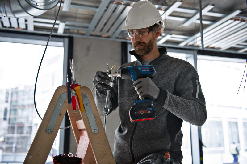 Akku-Heißluftgebläse GHG 18V-50, Arbeit unterwegs Das GHG 18V-50 Professional wurde für eine flexible Verwendung in jeder Umgebung konstruiert. Ausgestattet mit einer Schnellaufheizung auf bis zu 300 °C innerhalb von 6 Sekunden verliert dieses Akku-Heißluftgebläse keine Zeit beim Erreichen der gewünschten Temperatur. Dank seiner ausgezeichneten Tragbarkeit und Flexibilität eignet sich das GHG 18V-50 hervorragend für jede Arbeitsumgebung, sogar große Baustellen ohne Stromversorgung. Mit seinen zwei Temperaturstufen (300 °C + 500 °C) und dem LED-Licht ist das Heißluftgebläse jederzeit leicht zu bedienen. Das GHG 18V-50 Professional eignet sich für zahlreiche Anwendungen, einschließlich Schlauchschrumpfen. Es ist kompatibel mit allen für unsere kabelgebundenen Heißluftgebläse erhältlichen Düsen sowie sämtlichen Bosch Professional 18V-Akkus und -Ladegeräten (Professional 18V System). Für maximale Leistung ProCORE18V ? 4,0 Ah verwenden. Auch kompatibel mit AMPShare, der markenübergreifenden Akku-Allianz. Bei Verwendung des Akkus ProCORE18V 8.0Ah bei 300 °C beträgt die Akkulaufzeit bis zu 21 Minuten. L-BOXX 136 (1 600 A01 2G0). Reflektordüse, 32 x 33 mm (1 609 390 453). Reduzierdüse, 9 mm (1 609 201 797)