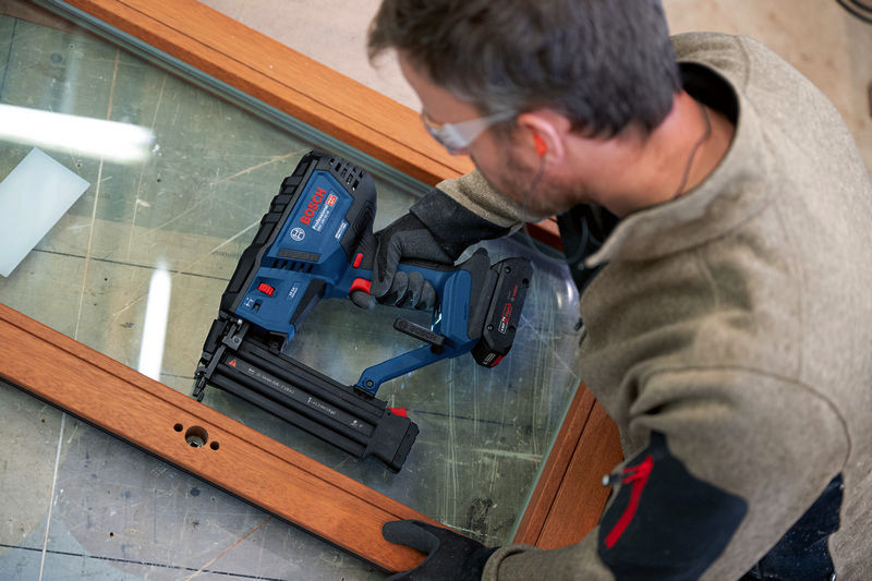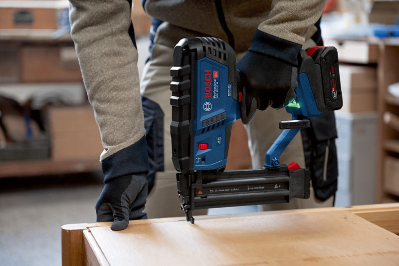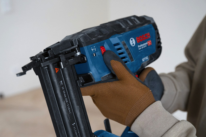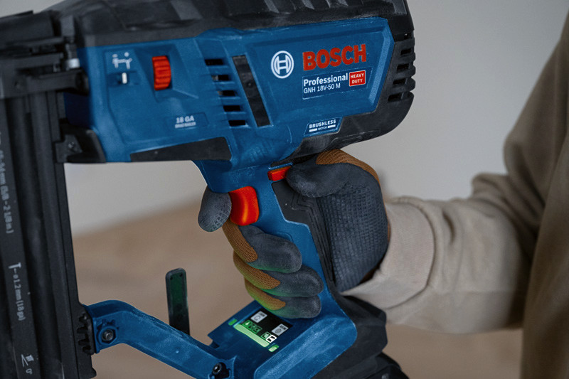 Akku-Holznagler GNH 18V-50 M, Als professioneller Handwerker willst du Nägel effizient und ohne zu große Belastung für Hand und Arm eintreiben. Wir haben den leistungsstarken, bürstenlosen GNH 18V-50 M Professional mit einem sehr geringen Rückschlag entwickelt, der dein Handgelenk schont. Außerdem haben wir darauf geachtet, dass du das Werkzeug einhändig einschalten und bedienen kannst. Dieses Werkzeug bietet die volle Leistung eines Druckluftnaglers, aber frei von Kompressor, Gaskartusche oder Kabel. Ideal für die Montage von Fenster- und Türrahmen, Zierleisten und Bordüren, Glasleisten, Sockelleisten, für Möbelbau und Schrankmontage sowie die Montage von Decken- und Bodenpaneelen mit Nut- und Federverbindung (verdeckte Nagelung). Kompatibel mit dem Bosch Professional 18V System und mit der markenübergreifenden AMPShare Akku-Allianz. Mit einhändig bedienbarem Ein-/Aus-Schalter, HMI mit Service-Warnung, Einzel- und Kontaktauslösung, benutzerfreundlicher stufenloser Tiefenverstellung, Trockenschuss-Sperre, Doppel-LED, großem Sichtbereich an der Kontaktspitze, werkzeuglosem Entfernen verklemmter Nägel. Geeignet für folgende Nägel: 16-54 mm, 18 ga (1,2 mm) und 0° Magazinwinkel. Karton