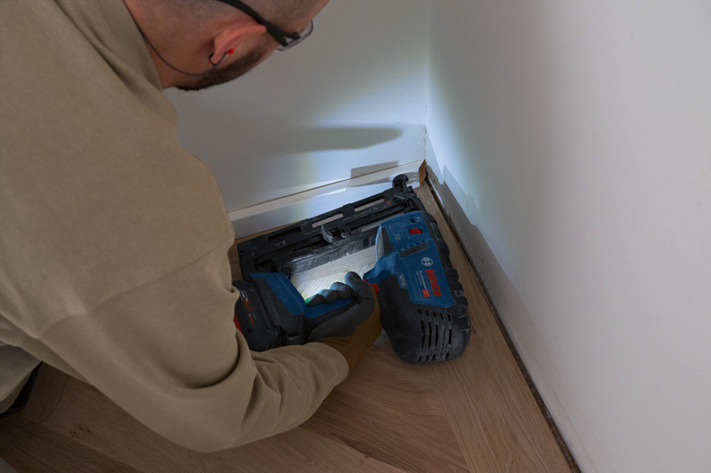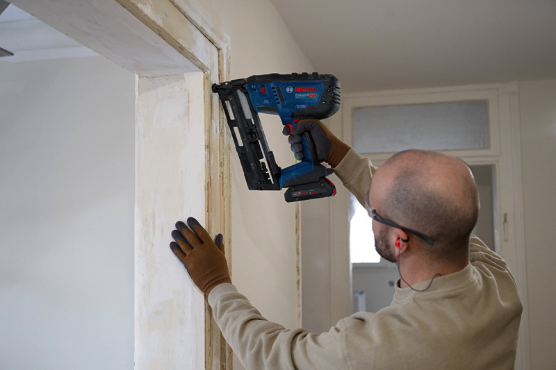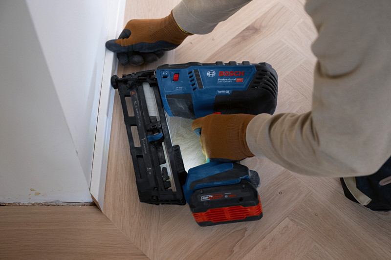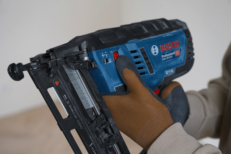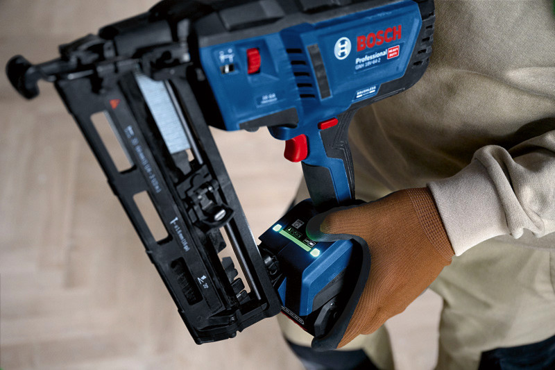 Akku-Holznagler GNH 18V-64-2, Als professioneller Handwerker willst du Nägel effizient und ohne zu große Belastung für Hand und Arm eintreiben. Wir haben den leistungsstarken, bürstenlosen GNH 18V-64-2 Professional mit einem sehr geringen Rückschlag entwickelt, der dein Handgelenk schont. Außerdem haben wir darauf geachtet, dass du das Werkzeug einhändig einschalten und bedienen kannst. Dieses Werkzeug bietet die volle Leistung eines Druckluftnaglers, aber frei von Kompressor, Gaskartusche oder Kabel. Ideal für die Montage von Fenster- und Türrahmen, Zierleisten, Balustern an Treppengeländern, Decken- und Bodenpaneelen mit Nut- und Federverbindung (verdeckte Nagelung), Täfelungen und Sockelleisten. Kompatibel mit dem Bosch Professional 18V System und mit der markenübergreifenden AMPShare Akku-Allianz. Mit einhändig bedienbarem Ein-/Aus-Schalter, HMI mit Service-Warnung, Einzelauslösung, benutzerfreundlicher stufenloser Tiefenverstellung, Trockenschuss-Sperre, Doppel-LED, großem Sichtbereich an der Kontaktspitze, werkzeuglosem Entfernen verklemmter Nägel. Geeignet für folgende Nägel: 32-64 mm, 16 ga (1,6 mm) und 20° Magazinwinkel. Karton