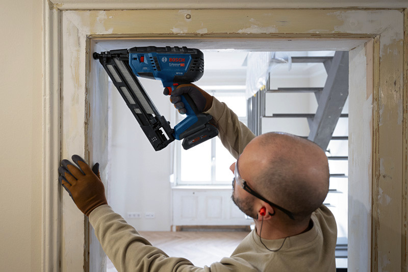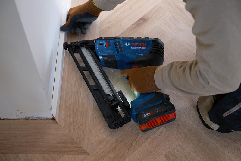Akku-Holznagler GNH 18V-64 MD, Als professioneller Handwerker willst du Nägel effizient und ohne zu große Belastung für Hand und Arm eintreiben. Wir haben den leistungsstarken, bürstenlosen GNH 18V-64 MD Professional mit einem sehr geringen Rückschlag entwickelt, der dein Handgelenk schont. Außerdem haben wir darauf geachtet, dass du das Werkzeug einhändig einschalten und bedienen kannst. Dieses Werkzeug bietet die volle Leistung eines Druckluftnaglers, aber frei von Kompressor, Gaskartusche oder Kabel. Ideal für die Montage von Fenster- und Türrahmen, Zierleisten, Balustern an Treppengeländern und Täfelungen. Kompatibel mit dem Bosch Professional 18V System und mit der markenübergreifenden AMPShare Akku-Allianz. Mit einhändig bedienbarem Ein-/Aus-Schalter, HMI mit Service-Warnung, Einzel- und Kontaktauslösung, benutzerfreundlicher stufenloser Tiefenverstellung, Trockenschuss-Sperre, Doppel-LED, großem Sichtbereich an der Kontaktspitze, werkzeuglosem Entfernen verklemmter Nägel. Geeignet für folgende Nägel: 32-64 mm, 15 ga (1,8 mm) und 34° Magazinwinkel. Karton