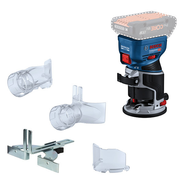 Akku-Kantenfräse GKF 18V-8, Sie kombiniert die Vorteile von High-End-Funktionen, einem kraftvollen bürstenlosen Motor und Kompatibilität mit verschiedensten Zubehören, die allen Aspekten des Kantenfräsens gerecht werden, von leichter Kantenprofilierung bis zu anspruchsvollerem Fräsen von Oberflächen. Diese 18V-Kantenfräse hat die geringste Höhe auf dem Markt für weniger Gewicht und ausgezeichnete Werkzeugkontrolle, eine handfreie Spindelarretierung für problemlosen Fräserwechsel und eine Schnitttiefen-Feineinstellung für ein überragendes Fräserlebnis. Darüber hinaus ist die GKF 18V-8 die weltweit einzige 18V-Kantenfräse mit zweckgerichteter Oberfläche und speziellen Saugadaptern für eine hocheffiziente Staubabsaugung in allen Situationen. Parallelanschlag (2 608 000 331). Absaugadapter für Oberflächenfräsen (2 608 190 061). Absaugadapter für Kantenfräsen (2 608 190 062). Spanschutz (2 608 190 065). Spannzange mit Überwurfmutter 8 mm (2 608 570 134). Spannschlüssel 17 mm (2 609 110 438)