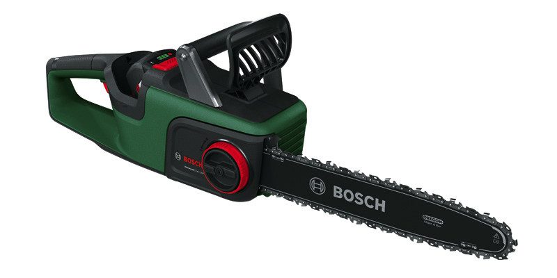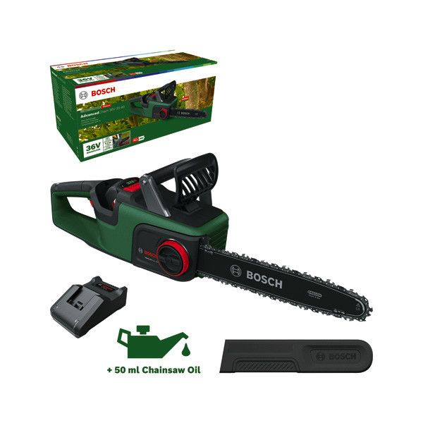 Akku-Kettensäge AdvancedChain 36V-35-40. Holzeinschlag und umfangreiches Ausasten mit einer kraftvollen Akku-Kettensäge. Bürstenloser Motor liefert Hochleistung für anspruchsvolles Sägen. Gleichmäßiges Schneiden sogar bei anspruchsvollen Arbeiten mit der OptiCut-Drehzahlsteuerung. Leicht und schlank für kontrollierte, präzise Schnitte. Müheloser Zusammenbau durch intuitives, werkzeugloses SDS. Rückschlagschutz durch QuickStop-Bremssystem. Syneon Technology für optimale Kraft und maximale Laufzeit. Kompatibel mit Bosch 36V POWER FOR ALL-Akku. 1 x Akku 36V 2,0Ah. Ladegerät AL 36V-20. Führungsstange. 1 x Sägekette, 35 cm. Kettenschutz. Kettensägenöl 50 ml. Quick Start Manual. Karton. Kettenspannhilfe