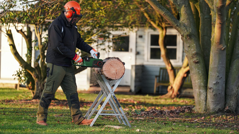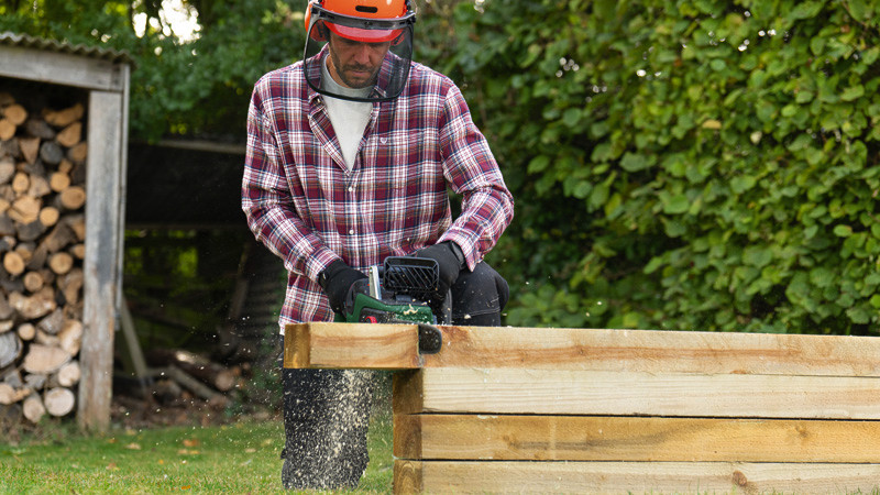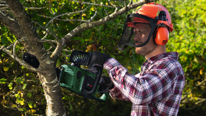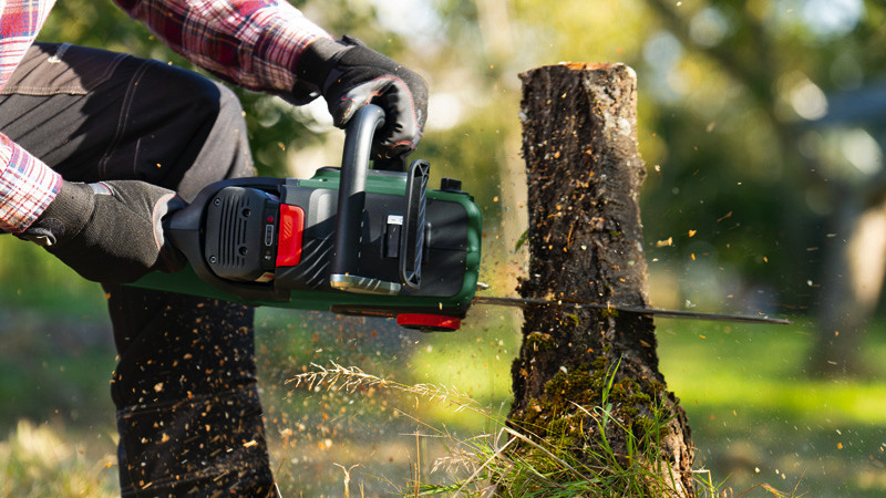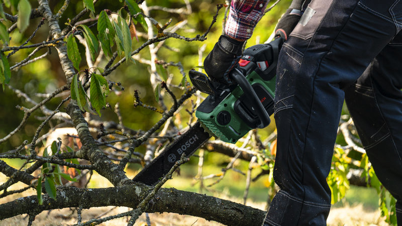 Akku-Kettensäge AdvancedChain 36V-35-40. Holzeinschlag und umfangreiches Ausasten mit einer kraftvollen Akku-Kettensäge. Bürstenloser Motor liefert Hochleistung für anspruchsvolles Sägen. Gleichmäßiges Schneiden sogar bei anspruchsvollen Arbeiten mit der OptiCut-Drehzahlsteuerung. Leicht und schlank für kontrollierte, präzise Schnitte. Müheloser Zusammenbau durch intuitives, werkzeugloses SDS. Rückschlagschutz durch QuickStop-Bremssystem. Syneon Technology für optimale Kraft und maximale Laufzeit. Kompatibel mit Bosch 36V POWER FOR ALL-Akku. Führungsstange. 1 x Sägekette, 35 cm. Kettenschutz. Kettensägenöl 50 ml. Quick Start Manual. Karton. Kettenspannhilfe