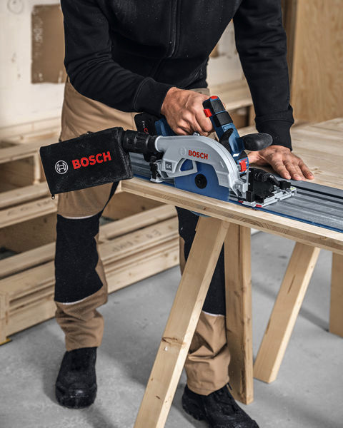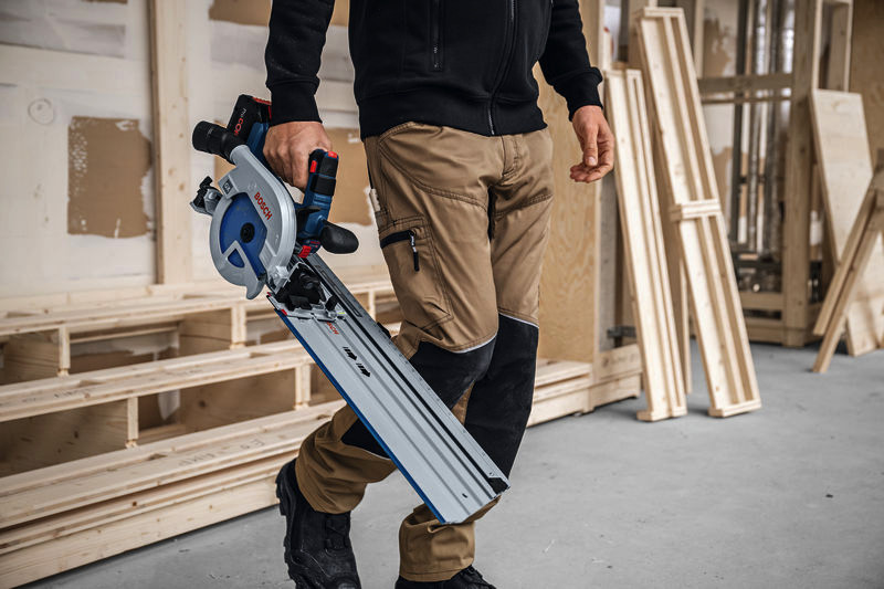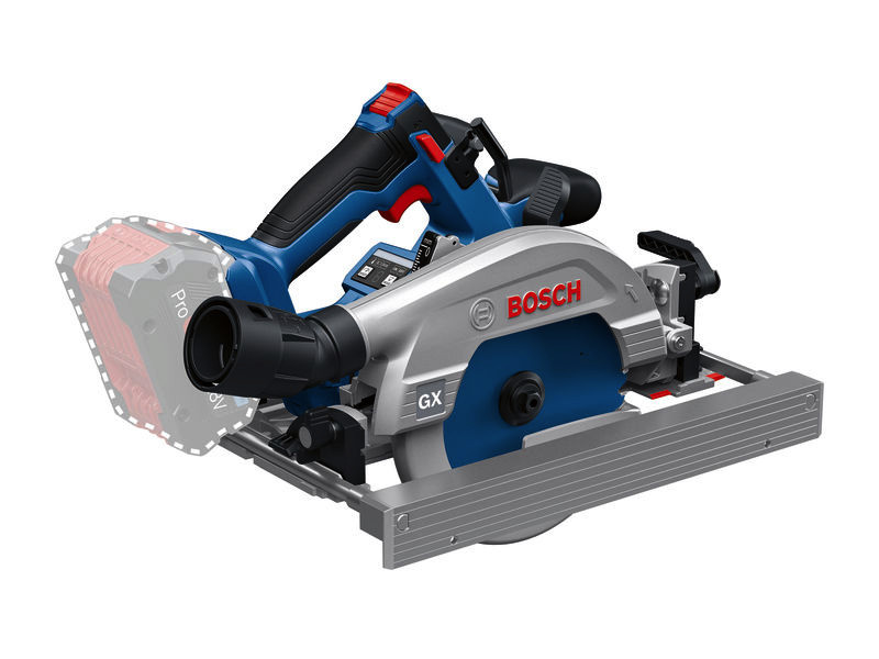 Akku-Kreissäge GKS 18V-57-2 GX, Bei Tischler- und Dachdeckarbeiten oder beim Holzrahmenbau ist eine kraftvolle Kreissäge erforderlich, die genaue Winkelschnitte in allen Positionen durchführt und mit Führungsschienen kompatibel ist. Die präzise Akku-Kreissäge GKS 18V-57-2 GX Professional ist das perfekte Werkzeug hierfür. Diese Säge mit hohem Anwendungskomfort bietet eine Schnitttiefe von bis zu 57 mm und kann Neigungsschnitte bis 50° ausführen. Und sie eignet sich für viele Einsatzbereiche in Kombination mit der Bosch Führungsschiene FSN und dem Führungsschienensystem für Querschnitte FSN X, durch das sie zu einer mobilen Säge für Querschnitte wird. Die GKS 18V-57-2 GX Professional liefert mit ihrem robusten, bürstenlosen Motor maximale Power. Diese Akku-Kreissäge ist ideal zum Schneiden von Holz- oder Holzverbundwerkstoffen in Balken, Fensterrahmen, kleinen Platten für Böden, Decken, Verkleidungen, Wandrahmen und mehr. Sie eignet sich außerdem zum Zuschneiden von Dämmmaterial und ist kompatibel mit der Bosch Führungsschiene und dem Führungsschienensystem für Querschnitte. Dank integriertem Click & Clean-Adapter, der mit allen Saugsystemen kompatibel ist, lässt sich Staub mühelos sammeln. Kompatibel mit dem Bosch Professional 18V System und mit der markenübergreifenden AMPShare Akku-Allianz. Für maximale Leistung einen ProCORE18V ? 5,5 Ah verwenden. Die GKS 18V-57-2 GX Professional ist mit Stop Control ausgestattet, mit der das Werkzeug automatisch das Schnittende erkennt und sich abschaltet, und sie verfügt über Drehzahlanpassung, ECO-Modus, KickBack Control und Überhitzungsschutz. Das flexible Sägeblatt ist ideal für wandnahes Schneiden und ein LED-Licht beleuchtet hell die Schnittlinie. Karton. Parallelanschlag (2 608 000 894)