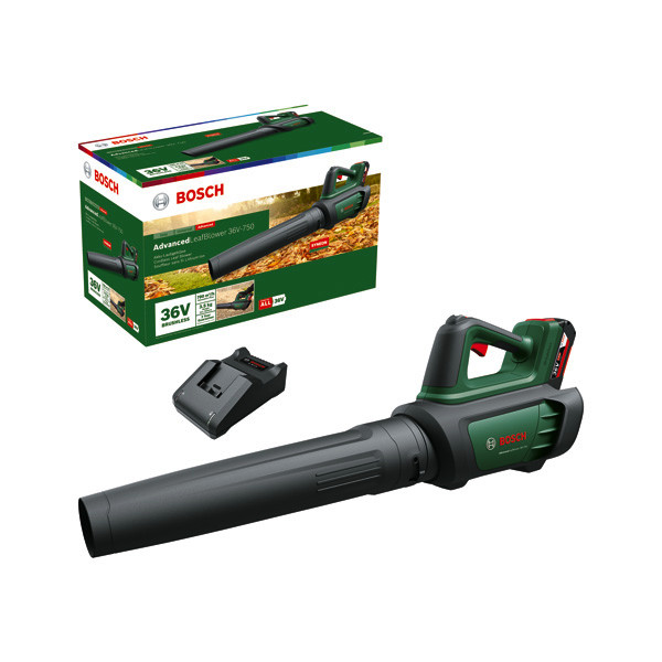 Akku-Laubbläser AdvancedLeafBlower 36V-750. Entfernen von hartnäckigem Laub mit starker, kabelfreier Leistung. Bürstenloser Motor liefert Hochleistung, anspruchsvolle Beseitigung von Gartenabfällen. Stufenlose Drehzahlregelung ermöglicht die optimale Wahl von Leistung, Geräuschpegel und Laufzeit. Belastungsfreies Arbeiten dank geringem Gewicht und gut ausbalanciertem Design. Axialgebläse entfernt hartnäckigen Schmutz von harten, unebenen oder nassen Oberflächen. Syneon Technology für optimale Kraft und Ausdauer nach Bedarf. 36V POWER FOR ALL der Akku für alle Bosch 36V Home & Garden-Geräte. 1 x Akku 36V 2,0Ah. Ladegerät AL 36V-20. Kartonschachtel