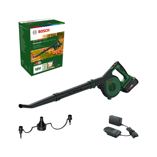 Akku-Laubbläser UniversalLeafBlower 18V-130. Leichter Akku-Laubbläser für schnelles und leichtes Säubern im Außenbereich. Beseitigt mühelos Laub und kleinere Schmutzteile von kleinen bis mittelgroßen Flächen. Leicht und kompakt: wiegt nur 1,6 kg und verfügt über einen bequemen, ergonomischen Griff. Leichte Bedienung mit 2 Geschwindigkeitsstufen für vielseitiges Säubern. Schnell und kraftvoll mit einer Luftstromgeschwindigkeit von bis zu 245 km/h. Syneon Technology für optimale Kraft und Ausdauer nach Bedarf. POWER FOR ALL ALLIANCE: 1 Akku, 10+ Marken, 150+ Produkte. 1 x Akku PBA 18V 2.5Ah. Ladegerät AL 18V-20. Kartonschachtel