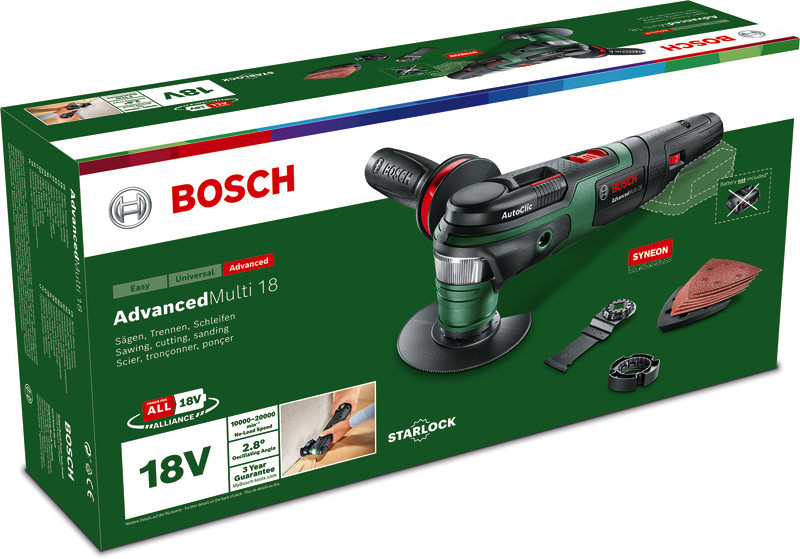 Akku-Multifunktionswerkzeug AdvancedMulti 18. Vielseitige, kabelfreie Lösung für die Bewältigung verschiedenster DIY-Projekte. Leistungsstarker Motor mit elektronischer Drehzahlvorwahl. 180°-Lichtband für optimale Beleuchtung des Arbeitsbereichs. Bosch AutoClic-System ermöglicht schlüssellosen Zubehörwechsel innerhalb von 3 Sekunden. Es ist umfangreiches Starlock-Zubehör für vielfältige Anwendungen erhältlich. POWER FOR ALL ALLIANCE: 1 Akku, 10+ Marken, 150+ Produkte. POWER FOR ALL: Ein Akku und Ladegerät für ein komplettes Home & Garden Werkzeugsystem. Die Syneon-Technologie steuert den Energieverbrauch für optimale Effizienz und längere Laufzeit. ACZ 85 EB (2 609 256 943). AIZ 32 EPC (2 609 256 947). Anti-Vibrationshandgriff (2 609 256 D59). Deltaschleifplatte 93 mm, AVZ 93 G (2 609 256 956). Deltaschleifblatt-Set (2 609 256 A54). 4-stufiger Tiefenanschlag für Segmentsägeblätter (2 609 256 C61). Kartonschachtel