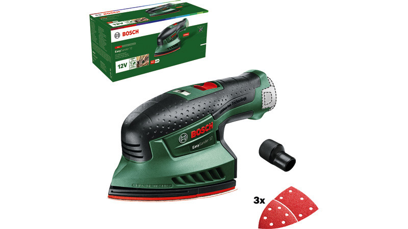 Akku-Multischleifer EasySander 12. Kompakt und kabellos für geläufige Schleifarbeiten und Reparaturen. Kompaktes, ergonomisches Design für eine leichte Bewältigung von Schleifarbeiten in Ecken, an Kanten und an kleineren flachen Oberflächen. PowerAutomatic erhöht automatisch die Leistung, wenn mehr Druck ausgeübt wird. Klettverschlusssystem ermöglicht einfache Schleifpapierwechsel. Adapter für den Anschluss an einen Staubsauger zur Staubabsaugung. Verwendung für Hartholz, Weichholz, gestrichene und lasierte Oberflächen. POWER FOR ALL: Ein Akku und ein Ladegerät für das komplette Home & Garden-Gerätesystem. Syneon Technology steuert den Energieverbrauch für optimale Effizienz und längere Laufzeit. Adapter für Staubsauger. 3 Schleifblätter K 80, K 120, K 160 (2 609 000 178). Karton