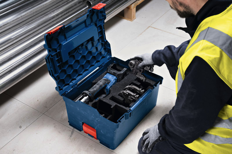 Akku-Presswerkzeug GPT 18V-19, Wenn du nach einem Akku-Presswerkzeug suchst, das leistungsstark, aber auch an engen Stellen leicht zu handhaben ist, ist der GPT 18V-19 Professional mit seinem kompakten Design und seinem um 360° drehbaren Kopf genau das Richtige für dich. Dank der schnellen Presszyklen lassen sich Rohre je nach Rohrdurchmesser in weniger als 3 Sekunden verbinden. Darüber hinaus gibt ein Status-LED-Licht visuell Rückmeldung zum Presszyklus, indem es einen erfolgreichen Zyklus bestätigt und vor möglichen Fehlern warnt. Der GPT 18V-19 Professional kann für alle gängigen Metall- und Kunststoff-Fittings verwendet werden. Das Werkzeug ist kompatibel mit kompakten Bosch Pressbacken, kompakten R-System-Pressbacken oder von Bosch zugelassenen Pressbacken und eignet sich für Rohre verschiedener Durchmesser. Der maximale Kompressionsbereich beträgt 40 mm für Kunststoffrohre und 35 mm für Metallrohre. Kompatibel mit dem Bosch Professional 18V System und mit der markenübergreifenden AMPShare Akku-Allianz. Der GPT 18V-19 Professional verfügt über eine einzigartige Schutzabdeckung, die den Akku optimal schützt. L-BOXX 238 (1 600 A01 2G2)