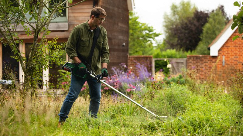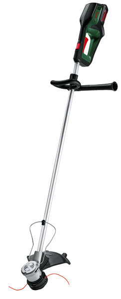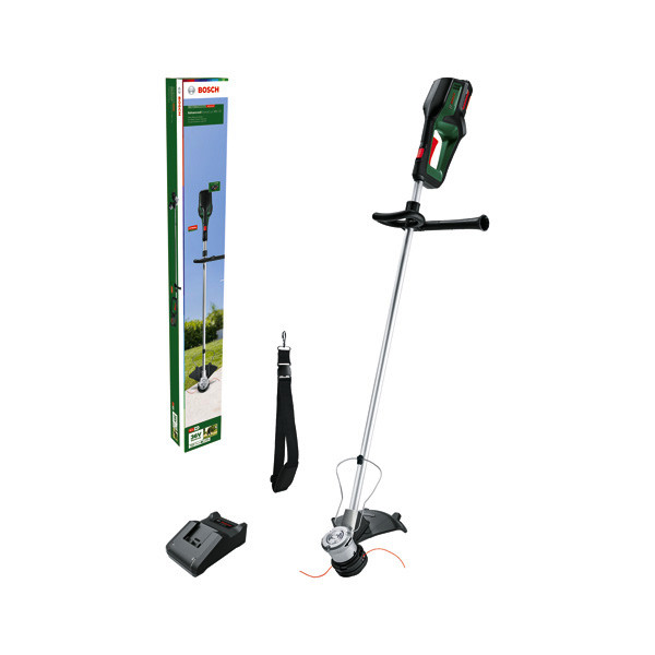 Akku-Rasentrimmer AdvancedGrassCut 36V-33. Kabelfreies, kraftvolles Trimmen in überwucherten, verwilderten Bereichen. Bürstenloser Motor liefert Hochleistung für anspruchsvolles Trimmen. Haltbare Materialien und eine bürstenlose Technologie sorgen für eine längere Lebensdauer. Gut ausbalancierte, verfeinerte Ergonomie für leichtes und trotzdem kraftvolles Trimmen. EasyWind-Spule für schnellen und einfachen Fadenwechsel. Smarte Elektronik sorgt für eine übergangslose Leistung und hält dabei die Drehzahl. Syneon Technology für optimale Kraft und Ausdauer nach Bedarf. 36V POWER FOR ALL der Akku für alle Bosch 36V Home & Garden-Gartengeräte. 1 x Akku 36V 2,0Ah. Ladegerät AL 36V-20. Schultergurt. Kartonschachtel