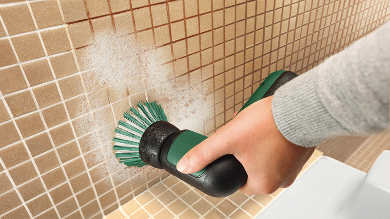 Akku-Reinigungsbürste Bürste. Entfernt hartnäckigen Schmutz schnell, mühelos und einfach. Die perfekte Hilfe für anspruchsvolle Reinigungsarbeiten. Für Waschbecken, Fliesen und Fugen in Bad und Küche. Reinigung von Felgen, Terrassenmöbeln und Fliesenfugen im Außenbereich. Nachhaltiges Design: wiederverwendbar und spülmaschinenfest bis 50 °C. Borstenbürste (1 600 A02 3KW). Kartonschachtel