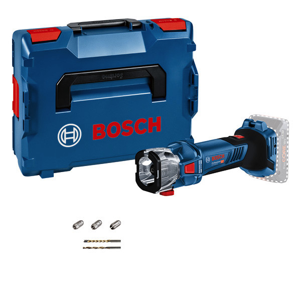 Akku-Trockenbaufräse GCU 18V-30, Dank ihrem kraftvollen bürstenlosen Motor mit einer Drehzahl von 30.000 min?¹ liefert die GCU 18V-30 den ganzen Tag Leistung und schneidet mehr als 100 Meter einer 12 mm dicken Trockenbauwand mit einem 1/8"-(3,17-mm-)Bit und einem einzigen ProCORE18V 4.0Ah-Akku. Die kompakte, leichte Bauweise ermöglicht bequemes Greifen in allen Positionen für länger ermüdungsfreies Arbeiten und ein staubdichter IP5X-Schalter, in den kein Trockenbaustaub eindringen kann, sorgt für eine höhere Werkzeuglebensdauer. Das Werkzeug ist geeignet für bündige Trockenbau-Schnitte nahe Fenstern, Türen, Zugangsplatten und Steckdosen. Sie schneidet auch Sperrholz, OSB und Deckenplatten, und ist kompatibel mit Spannzangen der Größen 3 mm, 6 mm, 1/8'', 5/32'', und 1/4''. Kompatibel mit dem Bosch Professional 18V System und mit der markenübergreifenden AMPShare Akku Allianz. Das Werkzeug wird standardmäßig mit 3 Spannzangen und einem hocheffizienten Staubadapter für einen gesünderen und saubereren Arbeitsort geliefert. Es verfügt auch über einen staubdichten IP5X-Schalter, der gegen feinen Trockenbaustaub und damit vorzeitigen Werkzeugausfall schützt, eine starke LED zur Beleuchtung des Schnittbereichs, eine Motorbremse für sofortiges Stoppen des Fräsers und einen Gürtelclip, damit du dein Werkzeug immer an deiner Seite hast. L-BOXX 136 (1 600 A01 2G0). 3 x Spannzange 3,17 mm (1/8") / 3,96 mm (5/32") / 6,35 mm (1/4") (2 608 000 826). 1 x Saugadapter (2 608 000 825). 1 x Trockenbau-Spiralnutfräser mit Führungsspitze, 3,17 mm (1/8"). 1 x Mehrzweckfräser 3,17 mm (1/8"). 1 x Gürtelhaken (2 609 111 584). Spannzangenschlüssel