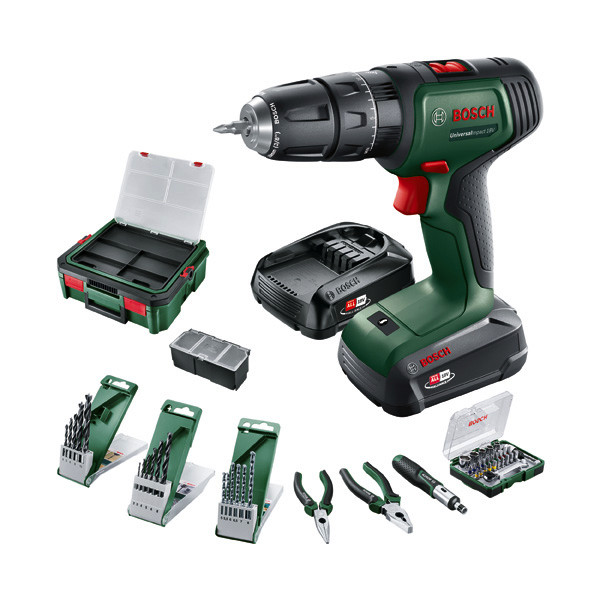 Akku-Schlagbohrmaschine UniversalImpact 18V + SystemBox. Kompaktes und leistungsstarkes Akku-Allroundwerkzeug für die Ausführung unterschiedlicher Arbeiten. Drehmomentvorwahl mit 20 Drehmomentstufen, Bohr- und Schlagbohreinstellung. LED-Licht für optimale Beleuchtung des Arbeitsbereichs. 10-mm-Schaft und ein einhülsiges Bohrfutter für leichten Schrauber- und Bohrerwechsel. Schrauben und Bohren in Holz und Metall, Schlagbohren in Mauerwerk. POWER FOR ALL: Ein Akku für das komplette Home & Garden Gerätesystem. 1 x Akku PBA 18V 1.5Ah. 1 x Akku PBA 18V 2.5Ah. Einzelne SystemBox Größe S (1 600 A01 6CT). 27-tlg. Schrauberbit-Set mit Ratsche (2 607 017 160). 6tlg. Metallbohrer-Set (2 609 255 029). 5tlg. Holzbohrer-Set (2 609 255 214). 5-tlg. Mauerwerkbohrer-Set (2 609 255 460). Zange. Flachzange. Handschrauber mit Ratsche. Ladegerät AL 18V-20. Karton