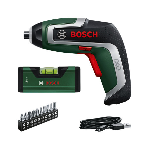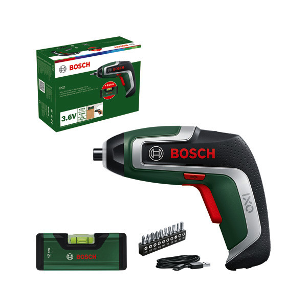 Akku-Schrauber IXO 7 Level Set. Mehr Power für alltägliche Schraubarbeiten. Kabelloser Allrounder zum Schrauben. 20 % höheres Drehmoment als sein Vorgänger durch stärkere Motorleistung. Multifunktionaler Einsatz als Bohrer, Korkenzieher, Schneidewerkzeug und mehr dank Aufsatzaufnahme. Längere Laufzeit bis zu 190 Schrauben dank optimiertem 2,0-Ah-Lithium-Ionen-Akku. Beleuchtet dunkle Arbeitsbereiche mit einem neuen 360°-LED-Lichtring. Lithium-Ionen-Technologie ohne Memory-Effekt oder Selbstentladung des Akkus. Micro-USB-Ladegerät für mobile Anschlussoptionen. Kompaktwasserwaage 12 cm. 10 Standard-Schrauberbits. Micro-USB-Kabel (1 607 000 CG9). Kartonschachtel