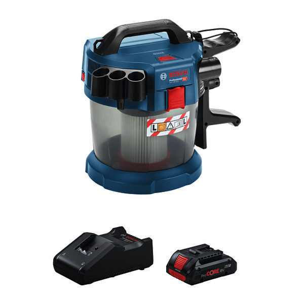 GAS 18V-10 L + PC 18V 4.0 Ah + GAL. Bestes Arbeitsergebnis durch eine perfekte Kombination aus GAS 18V-10 L, ProCORE18V 4.0Ah und GAL 18V-40. Akku-Staubsauger GAS 18V-10 L (0 601 9C6 302). 1 x Akku ProCORE18V 4.0Ah (1 600 A01 6GB). Schnellladegerät GAL 18V-40 Professional (1 600 A01 9RJ)