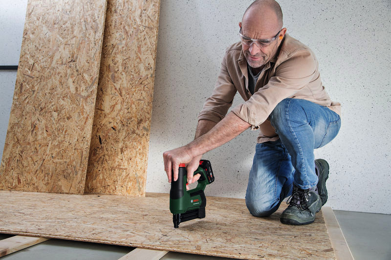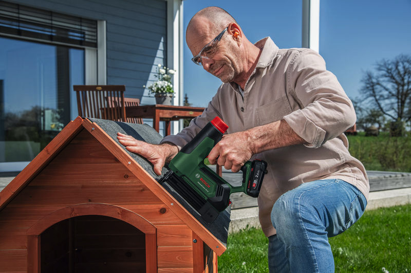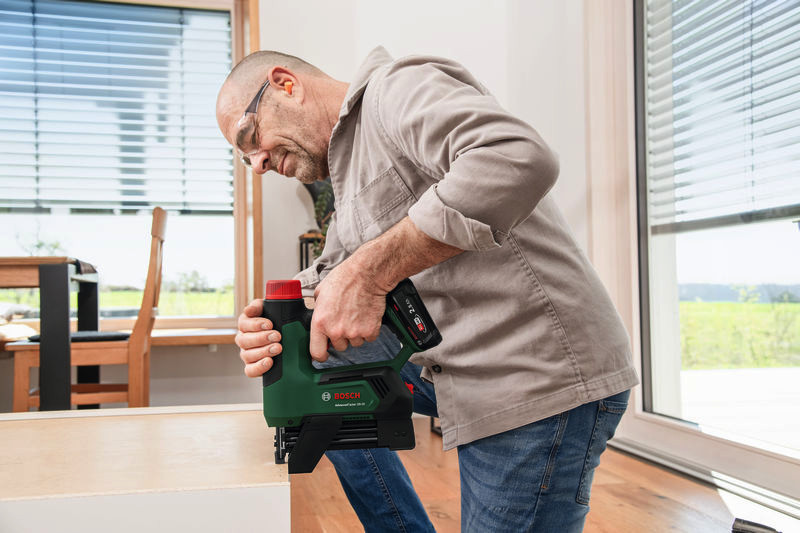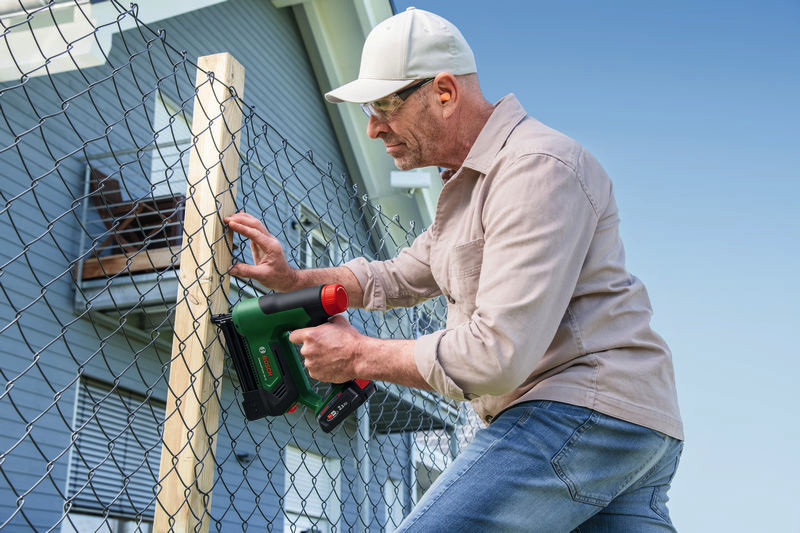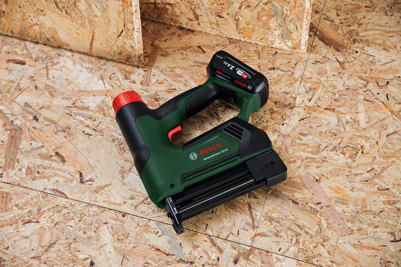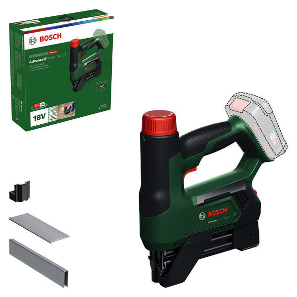 Akku-Tacker AdvancedTacker 18V-25. Leistungsstarker 2-in-1-Akku-Klammerer/Nagler für eine Vielzahl von Befestigungsaufgaben. Vielseitiger 2-in-1-Klammerer/Nagler: müheloses Befestigen von schmalen Kronenklammern und Brad-Nägeln. Abnehmbares Zubehör zur Abstandsführung: gewährleistet Positionierung jeder Klammer/jedes Nagels mit gleichem Abstand. Drehrad zur Schlagkrafteinstellung: Anpassung der Schlagkraft an die Klammerlänge und den Materialtyp. Push+Release-System für eine kontrollierte und sichere Handhabung. Eingebauter LED-Arbeitsscheinwerfer: Bietet hervorragende Sicht, auch bei schlechten Lichtverhältnissen. Austauschbare Nasenschutzkappe: schützende Nasenkappe zur einfachen Befestigung von Draht/Drahtgeflecht. POWER FOR ALL ALLIANCE: 1 Akku, 10+ Marken, 150+ Produkte. 1000 schmale Crown Heftklammern (20 mm). 500 Brad Nägel (25 mm). Zubehör Abstandsführung. Nasenkappe mit Drahtführung. Kartonschachtel