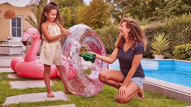 Akku-Volumenpumpe EasyInflate 18V-500. Entspanntes Aufpumpen großer aufblasbarer Gegenstände. Max. Luftdurchsatz von 530 l/min für schnelles Aufpumpen von Luftmatratzen, Schlauchbooten und Planschbecken. Ein-/Aus-Schalter für automatisches Aufpumpen und Luftablassen, 3 Düsen und ein 50-cm-Schlauch. Leicht, kompakt und einfach zu transportieren für eine bequeme Verwendung im Innen- und Außenbereich. Luftablassen durch einfachen Anschluss an das Ablassventil. POWER FOR ALL ALLIANCE: 1 Akku, 10+ Marken, 150+ Produkte. 3 Luftdüsen. Schlauch 50 cm. Stofftasche. Karton
