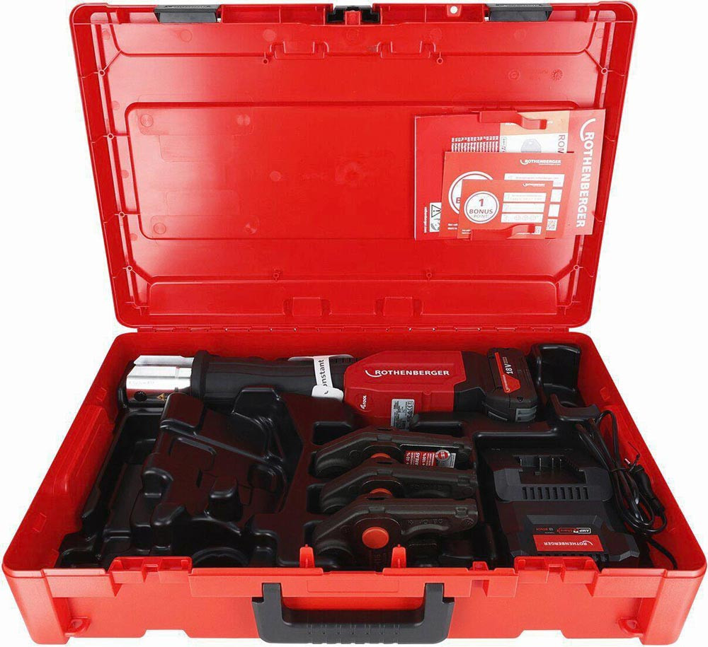 Das ROMAX 4000 Set EU AMPShare beinhaltet die Pressbacken der Kontur TH in den Größen 16-20-26 mm. Die elektrohydraulische · radiale Pressmaschine ROMAX 4000 AMPShare eignet sich ideal zum systemkonformen Verpressen von Fittings aus Metall · Kunststoff- und Mehrschichtverbundsystemen (MSR) bis 110 mm. Die ROMAX 4000 AMPShare verpresst Fittings mit einer Kolbenkraft von 32-34 kN und einem Presszyklus von 5 Sekunden. Ergonomisches und energieeffizientes Arbeiten auch über längere Zeit · werden durch das geringe Gewicht von 3,6 kg und einer ausgewogene Gewichtsverteilung ermöglicht. Konstante Presskraft über den kompletten Presszyklus wird durch die Constant Force Technology (CFT) garantiert. Durch das verbesserte Serviceintervall von 40.000 Presszyklen / 2 Jahren · wird eine hohe Produktivität gewährleistet. Geringes Gewicht von 3,6 Kg (mit 4.0 AH Akku) für ermüdungsfreies Arbeiten auch in schwierigen SituationenSchnelles Arbeiten durch Verpressungen unter 5 SekundenErhöhte Leistungskapazität durch verbesserte Akku-TechnologieErhöhter Serviceintervall nach 40.000 Verpressungen / 2 Jahren Die elektrohydraulische Akku-Pressmaschine mit AMPShare Akkutechnologie · zum systemabhängigen Verpressen von Fittingen in der Sanitär- · Heizungs- oder Klimabranche.