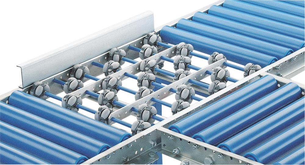 Zum rechtwinkligen Quertransport an Verteil- oder Eckpunkten von Rollen- und Röllchenbahnen.