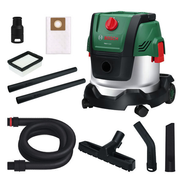 Allzwecksauger PAS15-220. Kompakt und leistungsstark: der Reinigungsprofi in der Familie für einfaches Staubsaugen. 1.200-W-Motor mit 220 mbar Saugleistung: entfernt mühelos nassen und trockenen Schmutz. UniversalAdapter: Anschluss an viele Elektrowerkzeuge für direkte Staubabsaugung. Flachfaltenfilter: für Nass- und Trockensaugen ohne Filterwechsel. Blasfunktion entfernt Schmutz an schwer erreichbaren Stellen. Leichte, stabile Bewegung: mit 15-l-Behälter und kippsicheren Rädern. 2 x extension plastic pipes (2 608 001 217). Suction hose 2.2 m (2 608 001 214). Elbow pipe (2 608 001 210). Floor nozzle (2 608 001 211). Crevice nozzle (2 608 001 209). Fleece bag PAS15-220 (2 608 001 222). Flat folded filter (2 608 001 219). Universal adapter (2 608 001 215). Kartonschachtel
