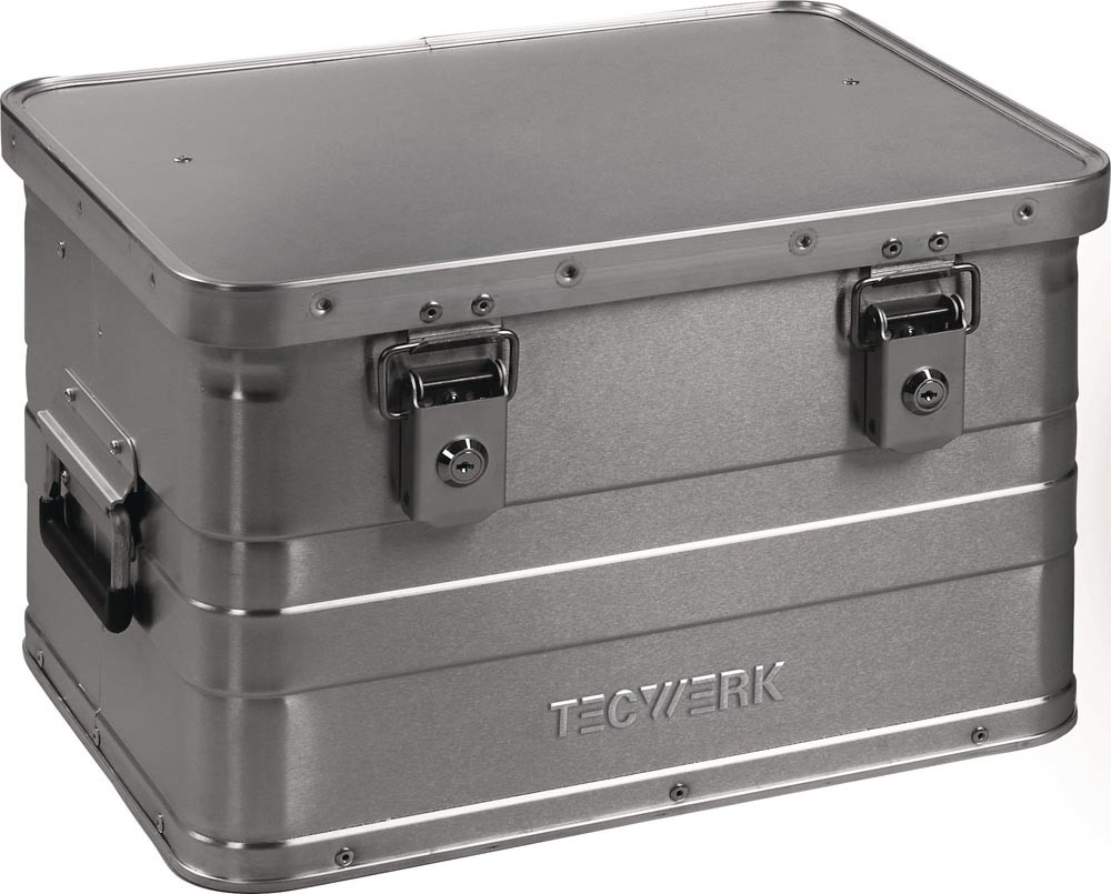 die Aluminiumboxen der Marke TECWERK sind witterungs-, temperatur- und korrosionsbeständig · Hebelspannverschlüsse mit 2 gleichschließenden Zylinderschlössern und Bohrungen für Plomben oder Vorhängeschloss · staub- und spritzwassergeschützt durch umlaufende Gummidichtung im Rahmenprofil · mit Federfallgriffen, kunststoffummantelt · stabiler Deckel · Temperaturbereich: -40 °C bis +180 °C