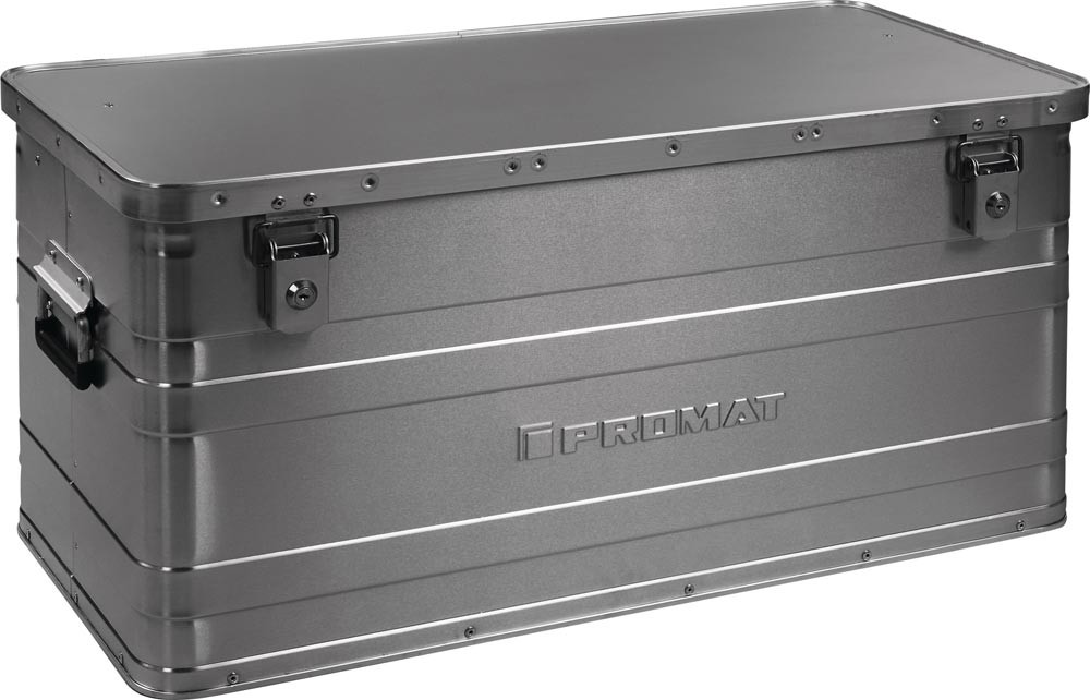 die Aluminiumboxen der Marke PROMAT sind witterungs-, temperatur- und korrosionsbeständig · Hebelspannverschlüsse mit 2 gleichschließenden Zylinderschlössern und Bohrungen für Plomben oder Vorhängeschloss · staub- und spritzwassergeschützt durch umlaufende Gummidichtung im Rahmenprofil · mit Federfallgriffen, kunststoffummantelt · stabiler Deckel · Temperaturbereich: -40 °C bis +180 °C