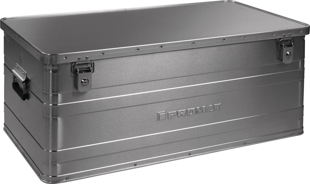 die Aluminiumboxen der Marke PROMAT sind witterungs-, temperatur- und korrosionsbeständig · Hebelspannverschlüsse mit 2 gleichschließenden Zylinderschlössern und Bohrungen für Plomben oder Vorhängeschloss · staub- und spritzwassergeschützt durch umlaufende Gummidichtung im Rahmenprofil · mit Federfallgriffen, kunststoffummantelt · stabiler Deckel · Temperaturbereich: -40 °C bis +180 °C