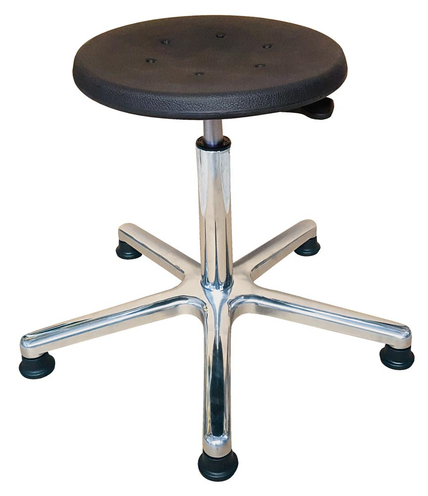 ∙ Elektrisch leitfähig ∙ Nach DIN EN 61340-5-1 ∙ Poliertes Aluminium-Fußkreuz ∙ Sicherheitsgasfeder verchromt ∙ PU-Sitz mit Stahleinlage ∙ PU-Sitz mit Hebelauslösung, Polster-Sitz mit Ringauslösung