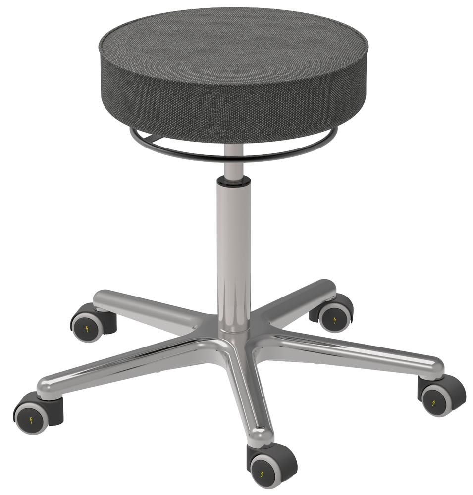 ∙ Elektrisch leitfähig ∙ Nach DIN EN 61340-5-1 ∙ Poliertes Aluminium-Fußkreuz ∙ Sicherheitsgasfeder verchromt ∙ PU-Sitz mit Stahleinlage ∙ PU-Sitz mit Hebelauslösung, Polster-Sitz mit Ringauslösung