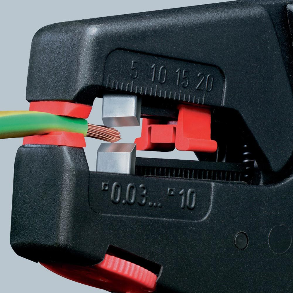 selbsteinstellend · für ein-, mehr- und feindrähtige Leiter mit Kunststoff- oder Gummiisolation · Drahtschneider für Cu- und Al-Leiter mehrdrähtig bis 10 mm² und eindrähtig bis 6 mm² · Messer und Kunststoff-Klemmbacken leicht auswechselbar · Gehäuse: aus glasfaserverstärktem Kunststoff · Messer: Spezial-Werkzeugstahl, ölgehärtet