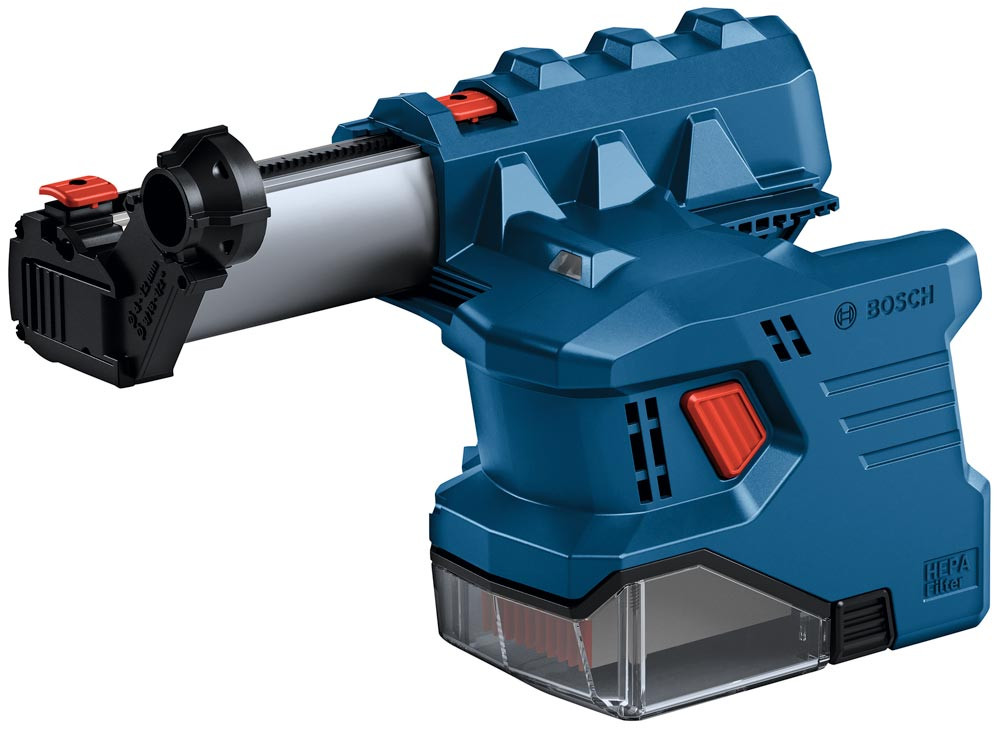 Kompakte und ergonomische Absaugung für staubfreies Bohren - auch bei Überkopfanwendungen für Bohrungen von 4-12 mm ∙ Große und ergonomisch geformte Entriegelungstasten für bequeme Einhandbedienung ∙ Perfekt zentriertes LED-Licht für den Arbeitsbereich ∙ Für den Bohrhammer GBH 18V-22