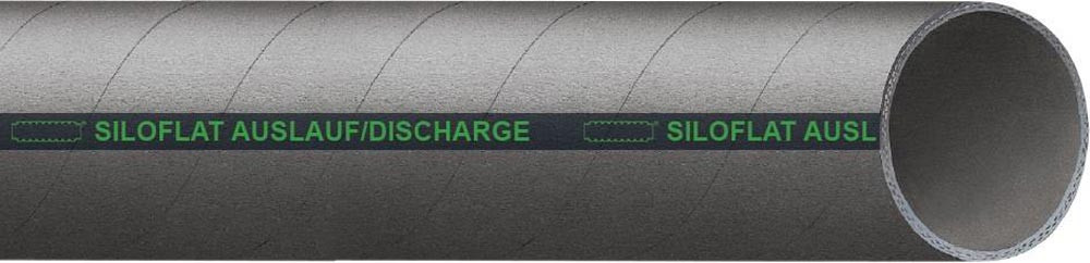 Betonsilo-Auslaufschlauch · Abriebwert Seele: 70mm³ · Aufdruck: Siloflat Auslauf/Discharge · Elektrischer Widerstand Aussendecke: Antistatisch <10⁹ Ω · Elektrischer Widerstand Schlauchseele: Elektrisch leitfähig <10⁶ Ω · Farbe Innenseele: Schwarz · Fertigungsart Innenseele: Glatt · Fertigungsweise Aussendecke: Gewickelt · Material Aussendecke: SBR/NR · Norm: EN ISO 1307:2008, ISO 4649 (vormals DIN 53516) · Platzdruck: 9bar